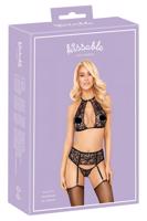Tento třídílný set spodního prádla z mimořádně jemného pletiva nabízí smyslný vzhled a maximální pohodlí. Detailní zpracování a nastavitelné popruhy umožňují dokonalé přizpůsobení, zatímco zvýrazňují ženské křivky. Proč je dobrý? Podprsenka bez výztuže a polstrování: přirozená podpora a pohodlí.Hluboký výstřih: smyslný vzhled mezi prsy.Nastavitelné ramínka a popruhy k podvazkům: přizpůsobení na míru.Měkký, elastický materiál: pohodlné nošení celý den.Speciální, dvouřemínkové kalhotky: jedinečný vzhled.Na co si dát pozor: Punčochy nejsou součástí balení.Doporučeno ruční praní v jemně čistícím prostředku.Nepoužívat žehličku, bělení ani sušení v sušičce.Jak používat: 1. Obleč si podprsenku a uprav nastavitelné popruhy pro pohodlné přizpůsobení.2. Nasaď si podvazkový pás a případně ho spoj s punčochami.3. Nosit kalhotky pro jedinečný vzhled a povzbuzení sebevědomí.4. Po použití následovat čistící doporučení pro zachování trvanlivosti materiálu.Obsah balení: 1 kus podprsenky s nákrčkem.1 kus podvazkového pásu s nastavitelnými popruhy.1 kus krajkových, dvouřemínkových kalhotek.Vlastnosti produktu: Materiál: 90% polyamid, 10% elastan.Barva: černá.Design:Zcela průsvitný, vzorovaný síťový materiál.Podprsenka bez výztuže a polstrování.Nastavitelné ramínka a popruhy k podvazkům.Dvouřemínkové kalhotky s obklopujícím designem.Péče: ruční praní s jemným čistícím prostředkem; nežehlit, nebělit, nesušit v sušičce.Mrkni na ukázkové video!